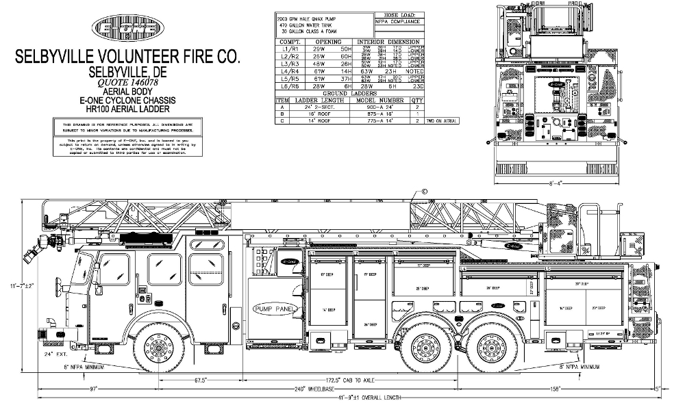 The Selbyville Volunteer Fire Company in Delaware has ordered a new E-ONE Quint with an HR 100 Aerial and Hale QMAX 2000 GPM pump. This unit will be built on a Cyclone 100” wide long cab powered by a Cummins X15 565 HP motor with an Allison EVS 4000 automatic transmission and a Jacobs engine brake. Features include but are not limited to: Bostrom seating for six (6) firefighters, a pre-piped/pinnable waterway with an Akron Streamaster II 1250 GPM electric nozzle, red, white and blue LED ladder climbing lights, Fire Tech scene lighting, Advanced Aerial Control System, Auto Level System for jacks, Harrison 8 KW hydraulic generator, a 200 foot cord reel, David Clark headset system, Whelen emergency lights, 119 feet of ground ladders and many more options and custom storage features. Thank you Selbyville Volunteer Fire Company for choosing E-ONE and Patriot Fire LLC!